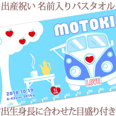 出産祝い 名入れ バスタオル 身長計 目印付き ポップデザイン ワゴンバス 名前入り プレゼント 男の子 女の子 選べる2カラー ベビー 赤ちゃん 孫 今治製 大判 湯上りタオル タオルケット 日本製 送料無料 名入れ無料 百日祝い ココロコ
